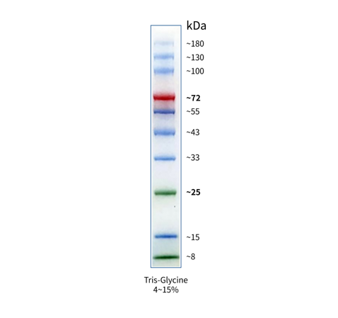 本產品包含了 8-180 kDa 的 10 種高度純化預染的重組蛋白質。10 種條帶分別為:8、15、25、33、43、55、72、100、130、180 kDa。其 8 kDa 和 25 kDa 條帶為綠色預染條帶,72 kDa 條帶為橙紅色預染條帶,方便判斷各個條帶準確位置。 本產品包裝便利,為即用型產品,請勿加熱、稀釋或添加還原劑。使用本產品可動態觀察蛋白電泳狀態和轉膜效果。經 SDS-PAGE 電泳后轉移到 PVDF 膜、NC 膜上可見清晰的彩色條帶。預染蛋白與染料結合后,在不同緩沖體系中,位置會有遷移,本產品在用于判斷目的蛋白分子量大小時僅供參考。