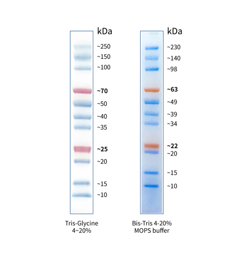 本產品由跨度從 10-250 kDa 的 11 種高度純化的橙色、藍色預染蛋白質組成。其中 25 kDa 條帶和 70 kDa 條帶為橙紅色預染條帶。本產品適合作為 SDS-PAGE 電泳時,變性蛋白樣品的分子量參照,并可實時觀察蛋白樣品的電泳分離狀況,也可用于檢測 Western blot 的轉膜效率。由于共價結合的染料會影響蛋白質分子的電泳遷移率,本產品僅適于粗略地估計目的蛋白樣品的分子量。